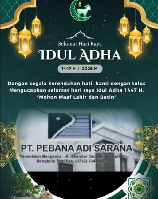 Metrobengkulu. com – Rejang Lebong,- Dalam rangka memperingati Hari Raya Idul Adha 1447 Hijriah yang bertepatan dengan tahun 2026 Masehi, PT. Pebana Adi Sarana menyampaikan ucapan Selamat Hari Raya Idul Adha kepada seluruh masyarakat, mitra kerja, dan karyawan.